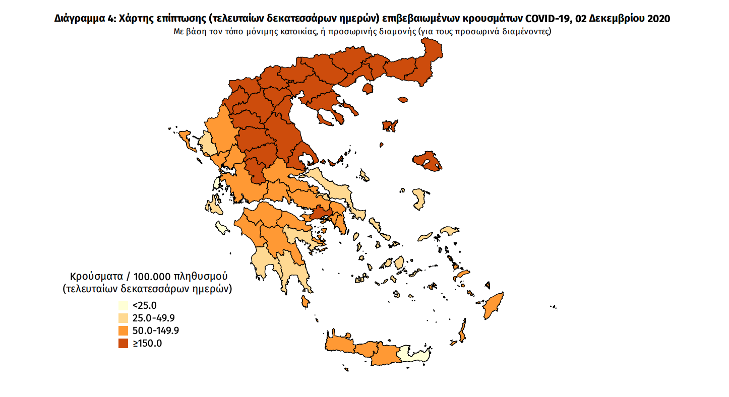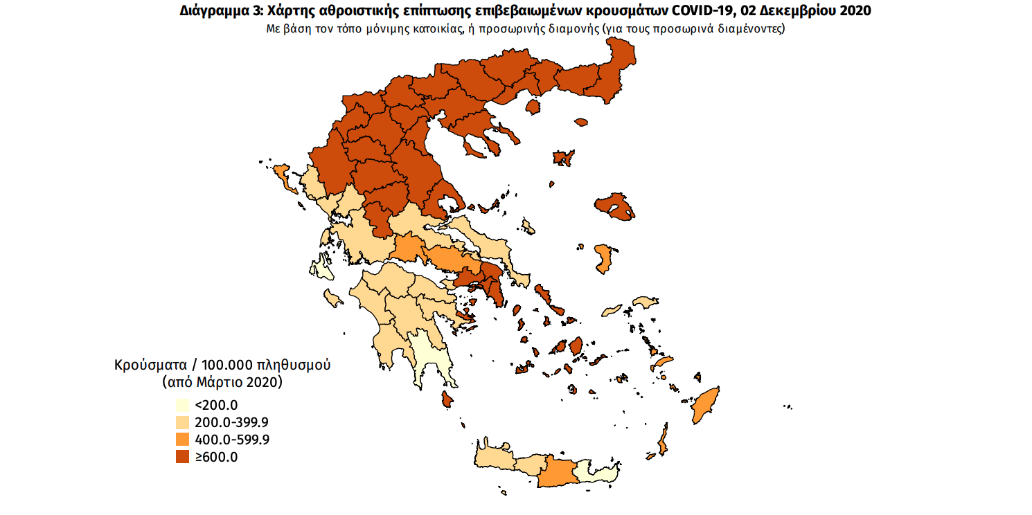 Γεωγραφική διασπορά Ο χάρτης αποτυπώνει τη γεωγραφική κατανομή των συνολικών κρουσμάτων COVID-19 (από την αρχή της επιδημίας) ανά Περιφερειακή Ενότητα της χώρας, με βάση την δηλωθείσα διεύθυνση μόνιμης κατοικίας του ασθενούς, ή τη διεύθυνση προσωρινής διαμονής για τους τουρίστες και άλλους προσωρινά διαμένοντες στην Ελλάδα. Συμπεριλαμβάνονται τόσο κρούσματα με ιστορικό ταξιδίου (“εισαγόμενα”) όσο και κρούσματα με πιθανή εγχώρια μετάδοση.