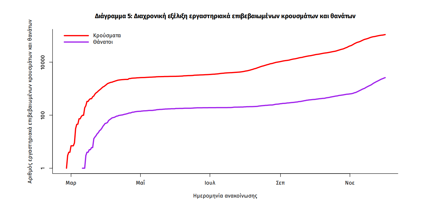 Η διαχρονική εξέλιξη των συνολικών κρουσμάτων και συνολικού αριθμού των θανάτων ασθενών COVID-19 παρουσιάζεται στο ακόλουθο διάγραμμα (σε λογαριθμική κλίμακα).