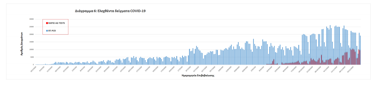 Δείγματα που έχουν ελεγχθεί: Από την 1η Ιανουαρίου 2020 μέχρι σήμερα, στα εργαστήρια που διενεργούν ελέγχους για τον νέο κορωνοϊό (SARS-CoV-2) και που δηλώνουν συστηματικά στον ΕΟΔΥ το σύνολο των δειγμάτων που ελέγχουν, έχουν συνολικά ελεγχθεί 2413710 κλινικά δείγματα ενώ από Μονάδες Υγείας και Κλιμάκια του ΕΟΔΥ που διενεργούν ελέγχους Rapid Ag έχουν ελεγχθεί 232453 δείγματα.