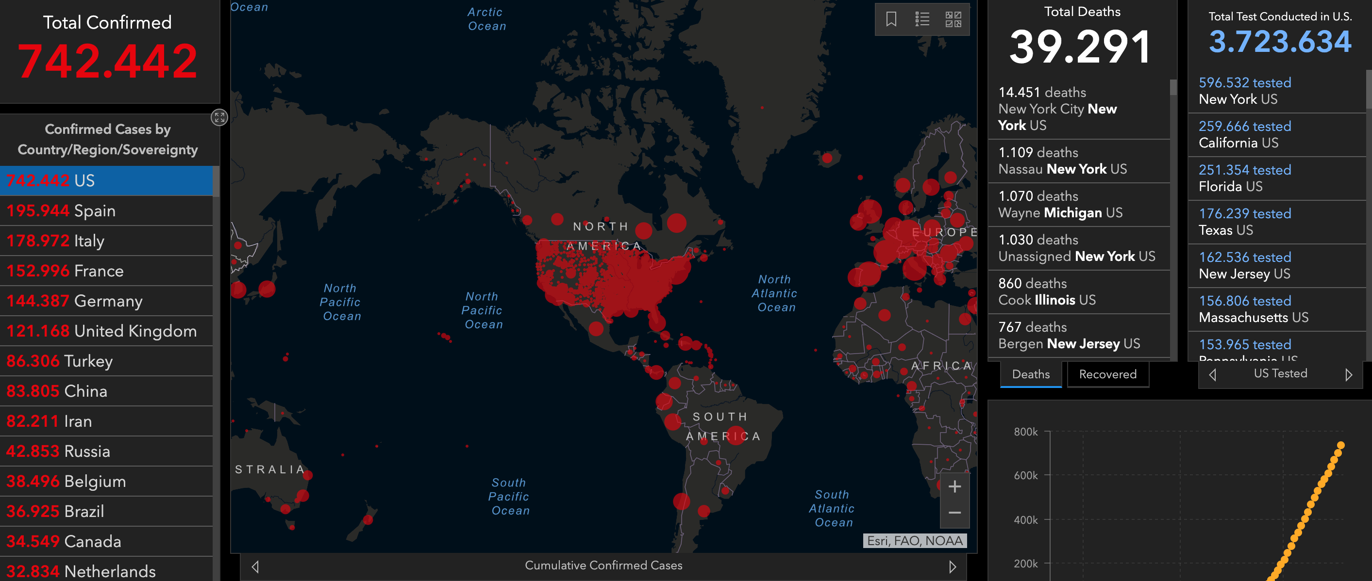 Οι Ηνωμένες Πολιτείες έχουν τον μεγαλύτερο αριθμό κρουσμάτων, με περισσότερα από 744.000 εξακριβωμένα κρούσματα. Τα κρούσματα αυξήθηκαν κατά 29.000 χθες, στην μικρότερη αύξησή τους κατά τις τρεις τελευταίες ημέρες.