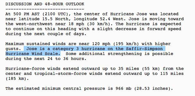 Ο κυκλώνας, ο οποίος μέσα σε μερικές ώρες ενισχύθηκε φθάνοντας από την κατηγορία 1 στην κατηγορία 3, μετακινείται 30 χλμ. την ώρα προς δυτική-βορειοδυτική κατεύθυνση, διευκρίνισε το NHC. Μοιάζει να ακολουθεί τα ίχνη του τυφώνα Ίρμα, του κυκλώνα κατηγορίας 5, ο οποίος προκάλεσε ήδη τεράστιες καταστροφές σε πολλά νησιά της Καραϊβικής. Το νησί Μπαρμπούντα, το οποίο ήδη υπέστη φοβερές ζημιές από τον κυκλώνα Ίρμα, κινδυνεύει να πληγεί και από τον Χοσέ, σύμφωνα με τους μετεωρολόγους του NHC.