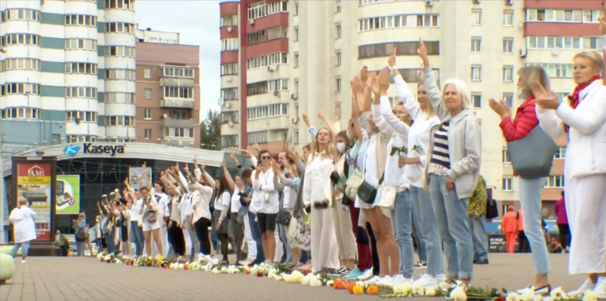 Στο ιστορικό κέντρο του Μινσκ, στην οδό Νεμίγκα, έχουν συγκεντρωθεί 100 άνθρωποι, με τις γυναίκες, πολλές από αυτές λευκοντυμένες, να κρατούν στα χέρια λουλούδια, καρδούλες ή πανό.