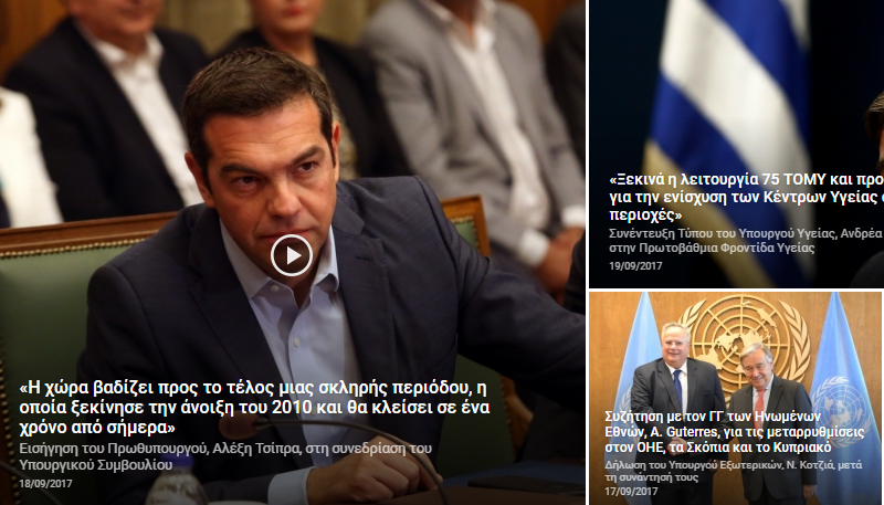 Στον ιστότοπο υπάρχουν η ομιλία του πρωθυπουργού Αλέξη Τσίπρα στη συνεδρίαση του Υπουργικού Συμβουλίου, ομιλίες, δηλώσεις, συνεντεύξεις υπουργών, ανακοινώσεις, δελτία Τύπου και ενημερώσεις υπουργείων για διάφορα ζητήματα.