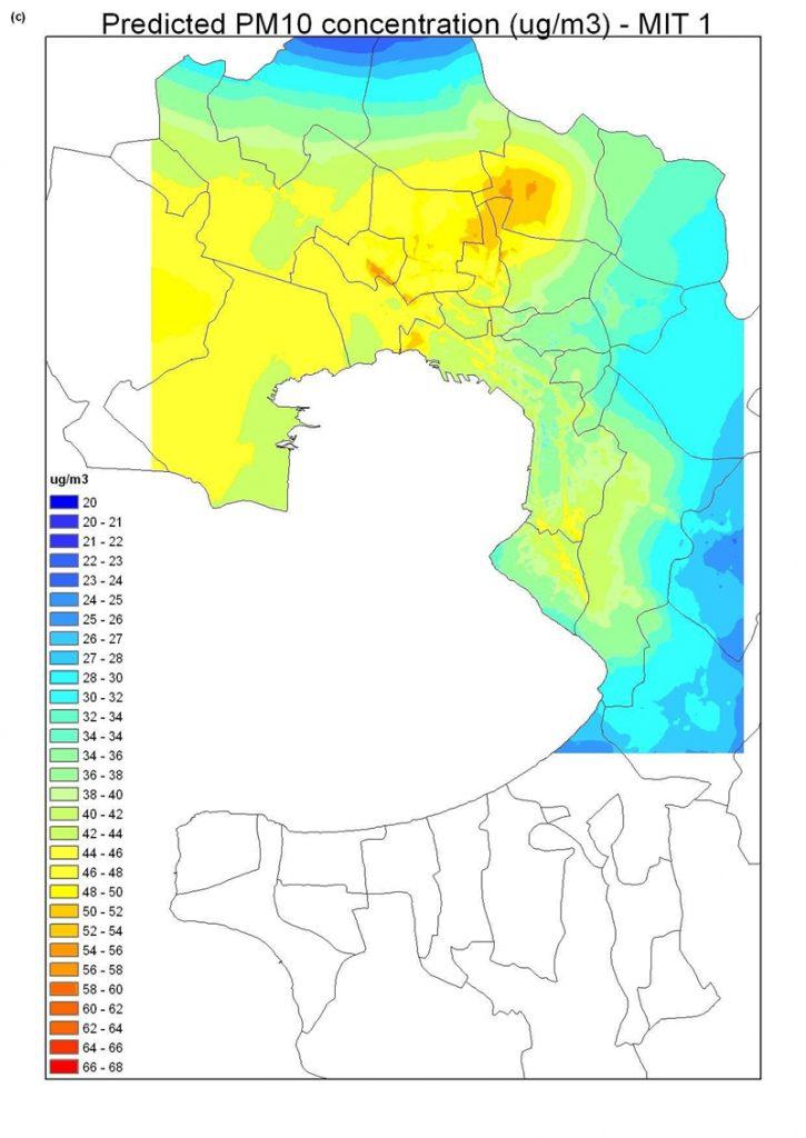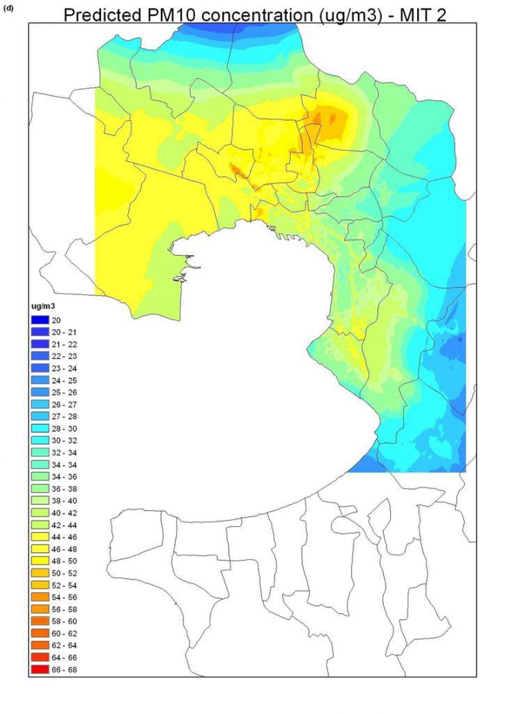 Στα ανωτέρω σχήματα αποτυπώνονται τα Επίπεδα PM10στον αέρα της Θεσσαλονίκης με τη σημερινή κατάσταση (businessasusual – BAU), με την εισαγωγή του μετρό και μόνο 2% διείσδυση ηλεκτροκίνητων ΙΧ στην αγορά (ΜΙΤ1), και τέλος με 50% διείσδυση ηλεκτροκίνητων ΙΧ στην αγορά (ΜΙΤ2) σε διάστημα 10 χρόνων.