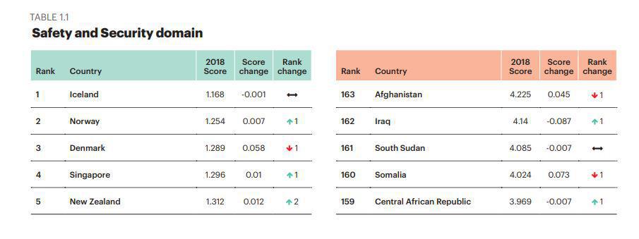 Για τον υπολογισμό της παγκόσμιας κατάταξης, λαμβάνονται υπόψη τα επίπεδα απειλής από το οργανωμένο έγκλημα, η τρομοκρατία, το ποσοστά ανθρωποκτονιών και η αξιοπιστία των αστυνομικών δυνάμεων.