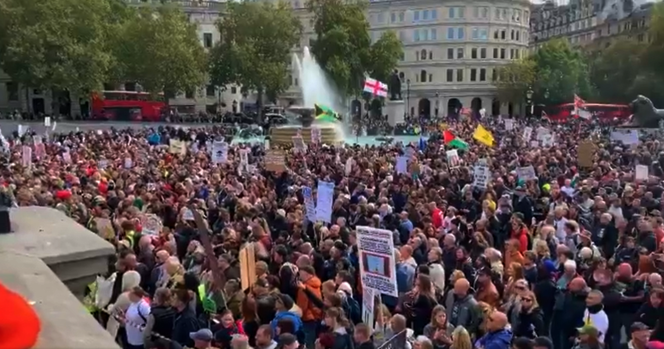 Κρατώντας πινακίδες με συνθήματα όπως “Δεν συναινούμε” και “Όχι στους ηλίθιους κανόνες”, χιλιάδες άνθρωποι κατέκλυσαν την Πλατεία Τραφάλγκαρ, για να διαδηλώσουν κατά των νέων περιορισμών.