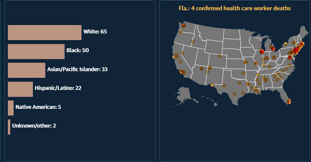 Η αμερικανική κυβέρνηση δεν διαθέτει ολοκληρωμένο αρχείο για τους γιατρούς και νοσοκόμους που πέθαναν από το Covid-19. Από τις 5 Αυγούστου, τα Κέντρα Ελέγχου και Πρόληψης Νοσημάτων ανέφεραν 598 θανάτους μεταξύ των εργαζομένων στον τομέα της υγείας, αλλά ο οργανισμός δεν απαριθμεί ονόματα. Σε πολλές πολιτείες δεν αναφέρονται καθόλου τα επαγγέλματα των αποθανόντων.