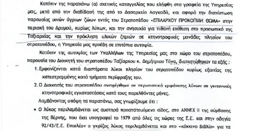 Μάλιστα παρουσιάστηκαν ίχνη λύκων μέσα στον χώρο του στρατοπέδου γεγονός που προκαλεί «την ανησυχία για πιθανή επίθεση στο προσωπικό της Ταξιαρχίας και την πρόκληση υλικών ζημιών σε κτηνοτροφικές μονάδες πλησίον του στρατοπέδου».