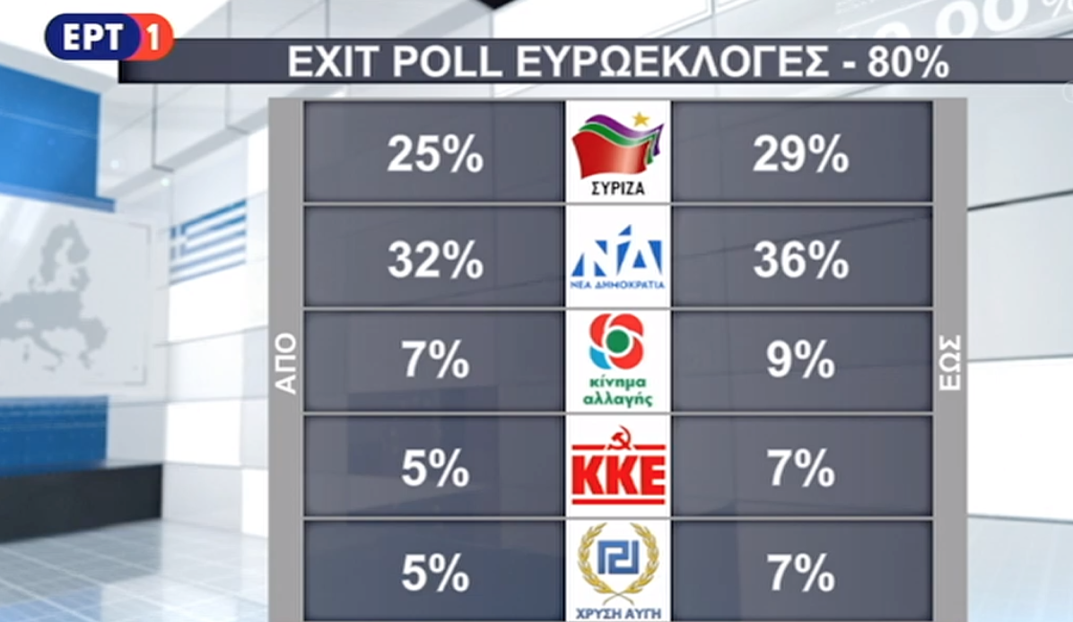 Νέα Δημοκρατία, Σύριζα, ΚΚΕ, ΚΙΝΑΛ, Χρυσή Αυγή μπαίνουν στο Ευρωκοινοβούλιο σύμφωνα με τα exit polls.