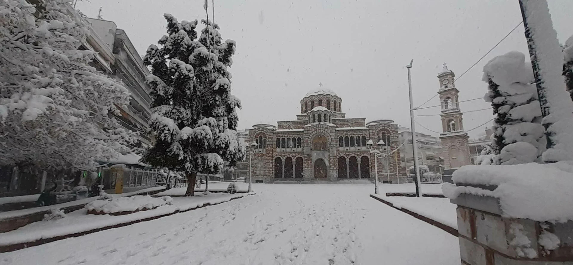Εντυπωσιακές είναι οι εικόνες από το χιονισμένο κέντρο του Βόλου.