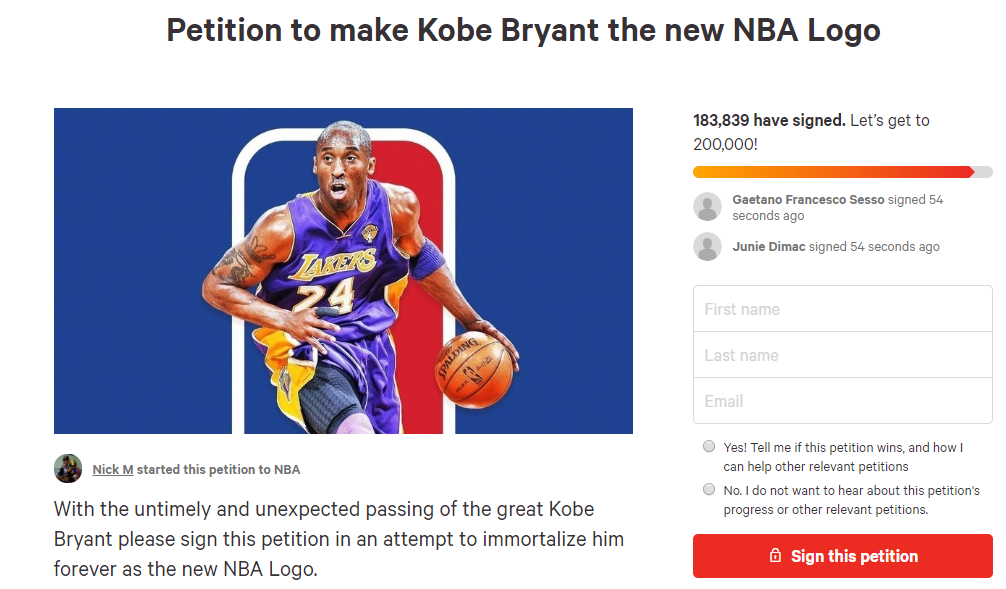 Πάνω από 180.000 υπογραφές έχουν μαζευτεί για να πάρει το σήμα του ΝΒΑ την μορφή του Κόμπι Μπράιαντ. Ένας Αμερικανός φίλαθλος ήταν αυτός που πρότεινε να αλλάξει το σήμα του NBA και αντί της μορφής του Τζέρι Γουέστ να έχει πλέον αυτή του αδικοχαμένου Κόμπι Μπράιαντ.