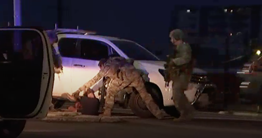 Ο ένοπλος συνελήφθη στην πολυσύχναστη διασταύρωση Στιούαρτ Χάιγουεϊ και Μακμίν Στριτ. Σε βίντεο που προβλήθηκαν από τοπικά τηλεοπτικά κανάλια φαίνεται ξαπλωμένος στο έδαφος, να προσπαθεί να κλοτσήσει τους αστυνομικούς που τον τράβηξαν και τον έβγαλαν κάτω από το λευκό αυτοκίνητό του.