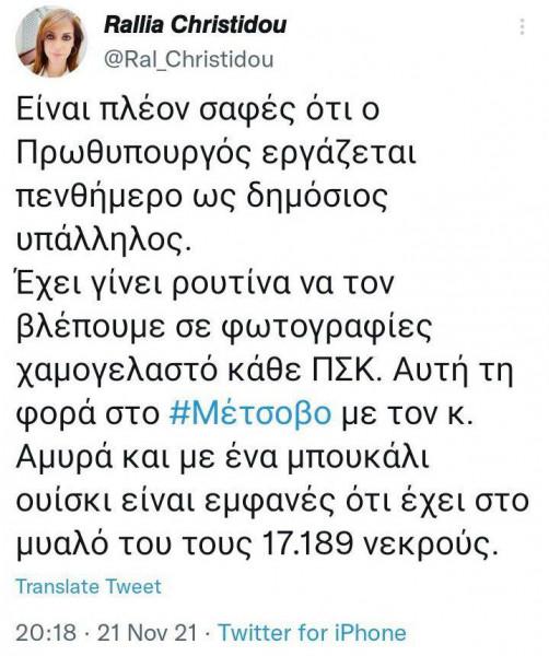 «Η διασπορά ψευδών ειδήσεων αποτελεί πάγια τακτική των υπογείων της Κουμουνδούρου, υπηρετώντας την επιλογή των προσωπικών επιθέσεων κατά του Πρωθυπουργού με κάθε τρόπο και μέσον, που έχει υιοθετήσει ο κ. Τσίπρας. Την τακτική αυτή μέχρι τώρα υπηρετούσαν γνωστοί δημοσιογραφικοί κύκλοι και διάφορα troll του διαδικτύου. Αυτή τη φορά στο «παιχνίδι» μπήκαν και βουλευτές του ΣΥΡΙΖΑ. Η κα Ραλλία Χρηστίδου, με fake ανάρτησή της έδωσε το σύνθημα για άλλη μια επίθεση, εμφανίζοντας ως χθεσινή, επίσκεψη του Πρωθυπουργού στο Μέτσοβο που είχε γίνει το 2019! Ύστερα από την κατακραυγή αναγκάστηκε να κατεβάσει την ανάρτηση. Αλλά αυτό δεν αρκεί. Είναι ανεπίτρεπτο μέλη του Κοινοβουλίου να λειτουργούν ως troll του διαδικτύου δημιουργώντας fake news. Η κα Χρηστίδου οφείλει να ζητήσει δημόσια συγγνώμη. Και όσο κ. Τσίπρας επιμένει να μην αποδοκιμάζει τέτοιες ενέργειες επιβεβαιώνει ότι βουλευτές και κάποιοι πρώην υπουργοί του βρίσκονται σε διατεταγμένη υπηρεσία», αναφέρεται στην ανακοίνωση του Γραφείου Τύπου του πρωθυπουργού.