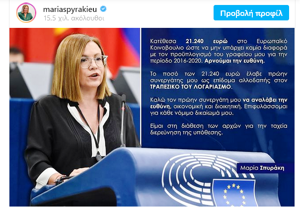 Η ευρωβουλευτής Μαρία Σπυράκη, για την οποία ο Εισαγγελέας διεξάγει έλεγχο για οικονομικές παρατυπίες, επιρρίπτει τις ευθύνες στον συνεργάτη της,