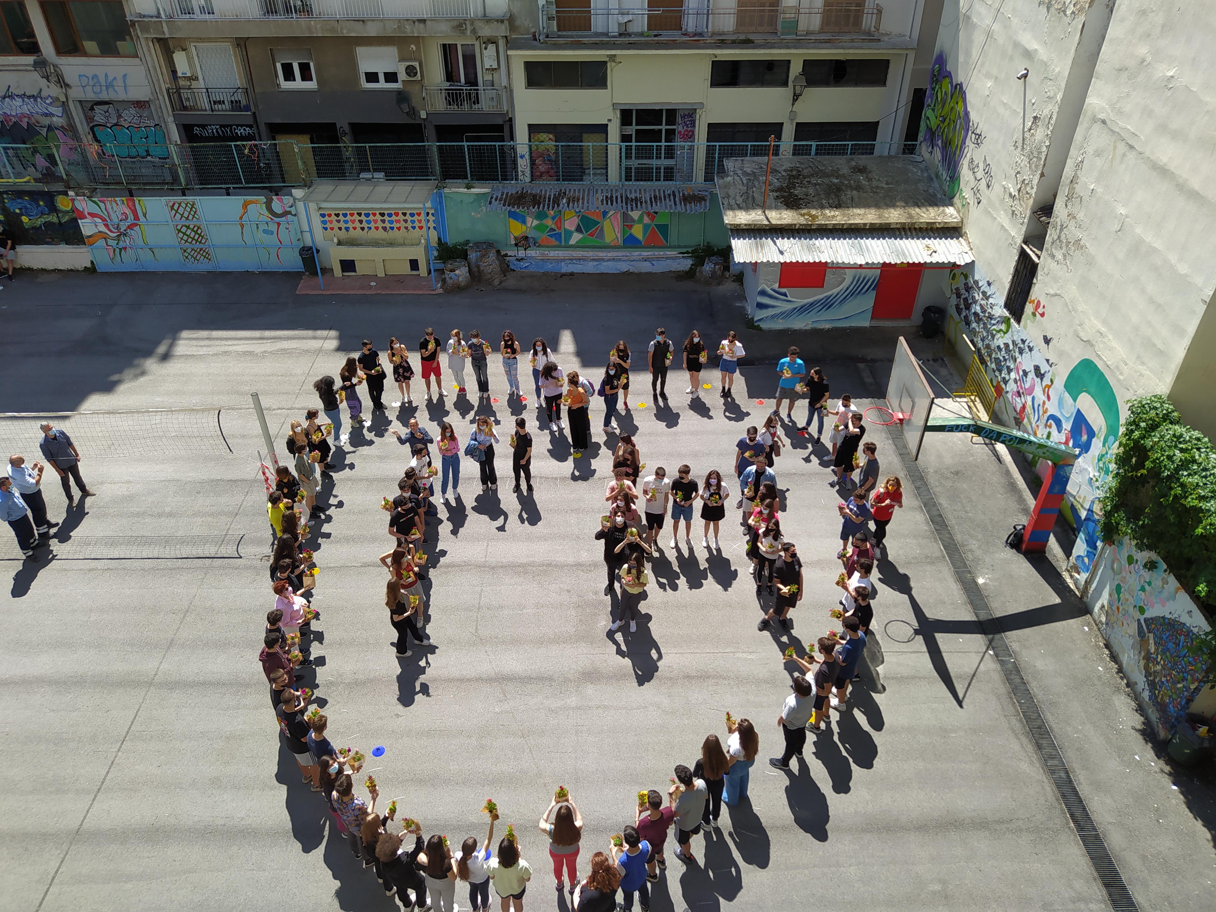 Στη συνέχεια, τα παιδιά κρατώντας λουλούδια σχημάτισαν μια καρδιά με τη λέξη «γη» στέλνοντας το δικό τους μήνυμα για την προστασία του περιβάλλοντος.