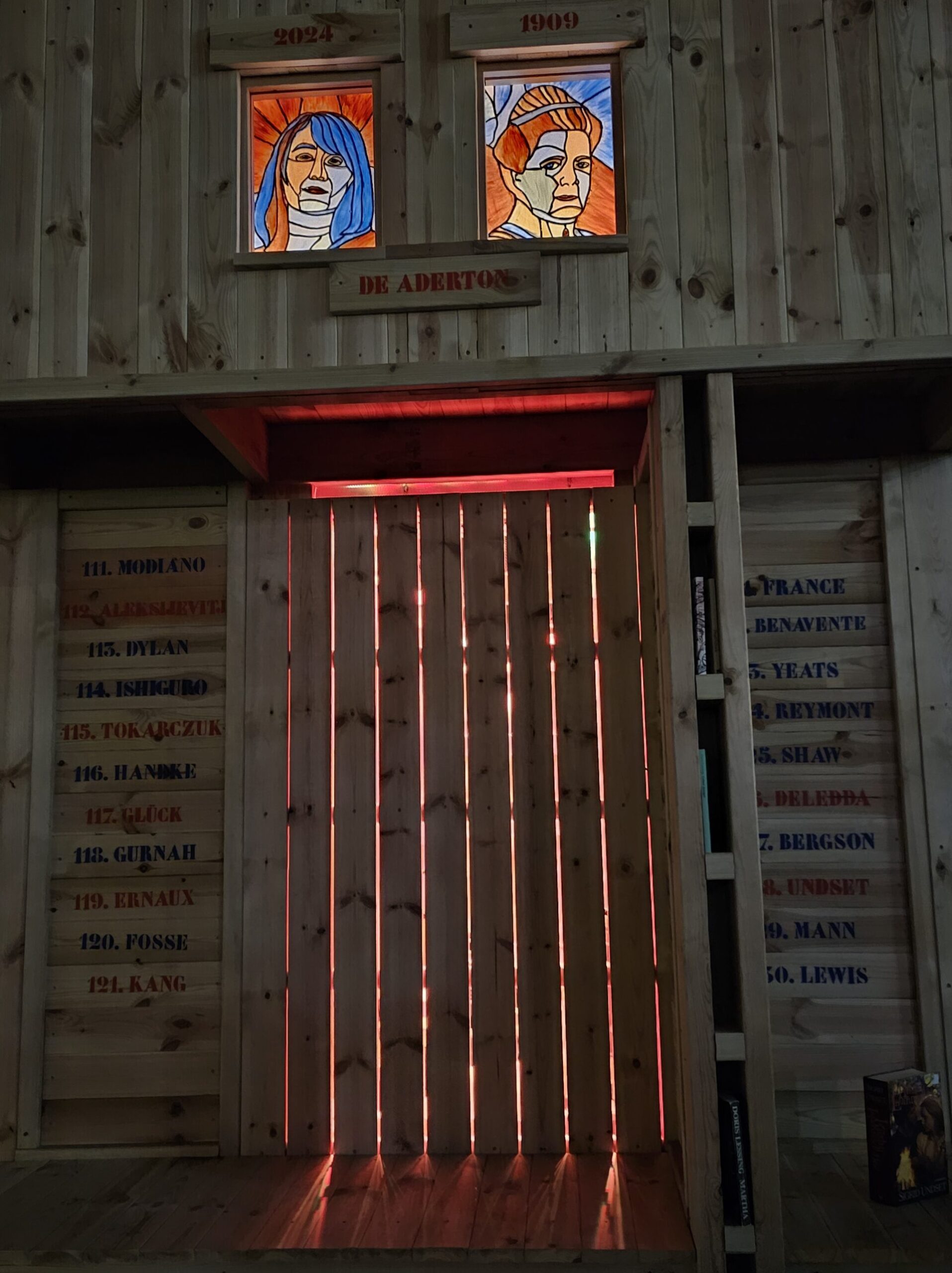 Η De Aderton προβάλλει τις γυναίκες συγγραφείς αναδεικνύοντας ταυτόχρονα την άνιση κατανομή στα βραβεία, δεκαοκτώ γυναίκες και 103 άνδρες από το 1901 μέχρι σήμερα. Τα γυναικεία πορτρέτα αντλούν έμπνευση από την πρώιμη εκκλησιαστική τέχνη με χρήση βιτρό και η εγκατάσταση συνοδεύεται από μουσική εμπνευσμένη από τα λογοτεχνικά έργα των συγγραφέων.