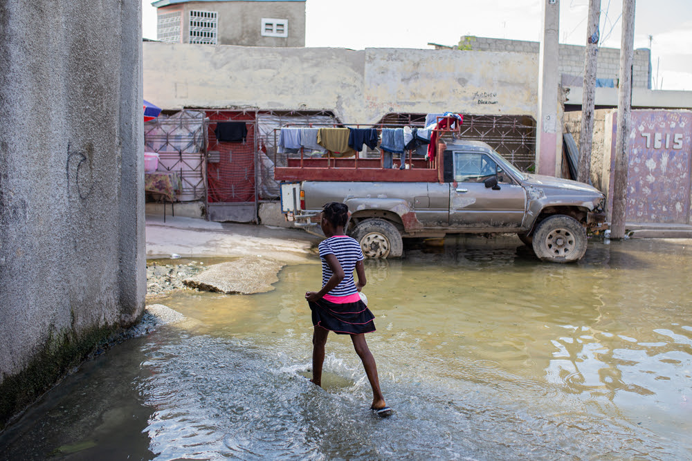 Ένα παιδί περπατά σε έναν πλημμυρισμένο δρόμο σε γειτονιά του Port-au-Prince στην Αϊτή. Οι πλημμύρες προκαλούνται από κανάλια που έχουν φράξει εξαιτίας κακής διαχείρισης αποβλήτων. Σε τέτοιες περιπτώσεις η χολέρα εξαπλώνεται γρήγορα λόγω της ανεπαρκούς επεξεργασίας λυμάτων και της έλλειψης πρόσβασης σε καθαρό νερό. Αϊτή – Οκτώβριος 2022 ©Alexandre Marcou / MSF