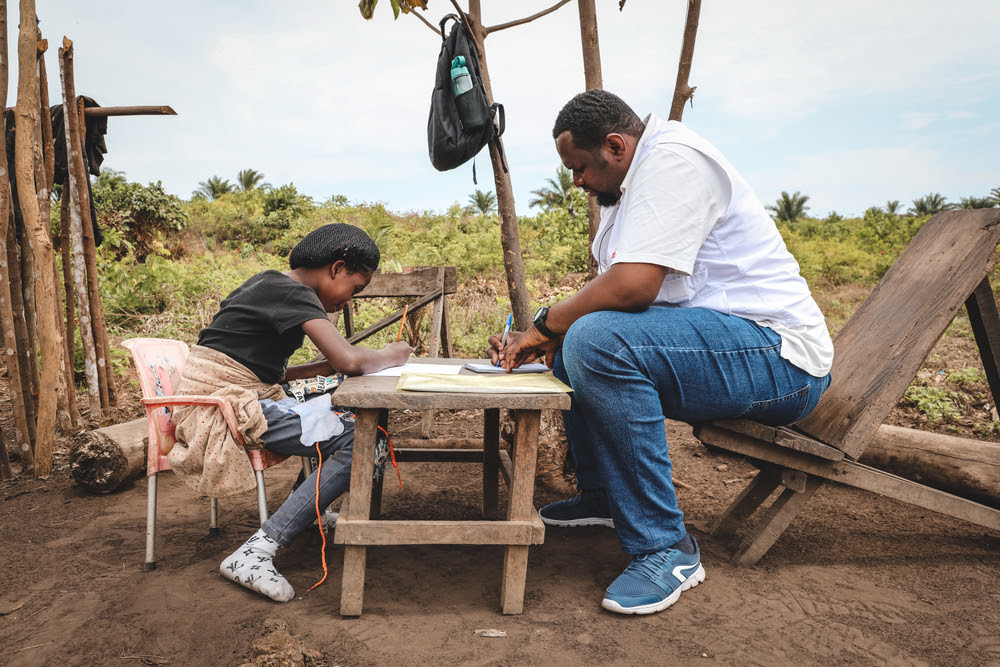 Ένα μικρό κορίτσι μαζί με τον ψυχολόγο των Γιατρών Χωρίς Σύνορα σε καταυλισμό για εκτοπισμένους στην περιοχή Kwamouth. Εκτός από τη θεραπεία τραυματιών και ασθενών, οι ομάδες των Γιατρών Χωρίς Σύνορα πραγματοποιούν συνεδρίες ψυχικής υγείας για να βοηθήσουν άτομα που έχουν τραυματιστεί ψυχικά από τη βία. Λαϊκή Δημοκρατία του Κονγκό – Σεπτέμβριος 2022. ©Johnny Vianney Bissakonou / MSF