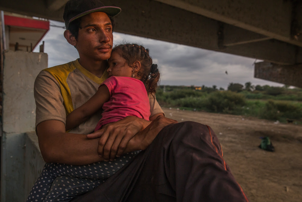 Ένας άνδρας από τη Βενεζουέλα κρατά αγκαλιά την κόρη του, κοιτάζοντας πέρα από την προβλήτα, κατά μήκος του ποταμού Tumbes. H προβλήτα απέχει 23 χιλιόμετρα από τα σύνορα Περού-Ισημερινού, εκεί όπου οι άνθρωποι ξεκουράζονται και βρίσκουν καταφύγιο πριν συνεχίσουν το ταξίδι τους προς τα σύνορα. Περού – Μάρτιος 2022 ©Max Cabello Orcasitas