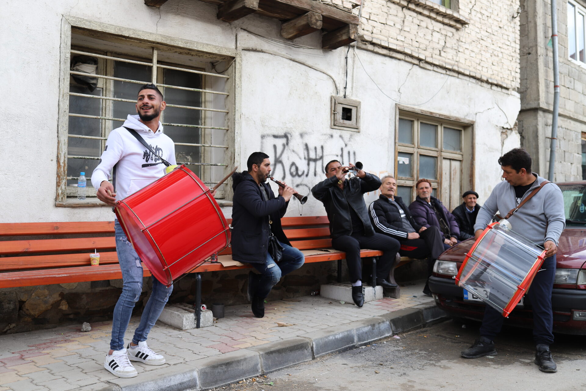 Την πομπή συνεχώς προϋπαντεί ένας άντρας που κρατάει το «Μπαϊριάκ», την γαλάζια σημαία του γάμου. Το όλο σκηνικό θυμίζει σκηνές βγαλμένες από γαμήλιες φωτογραφίες αρκετά παλαιότερων εποχών που πολλοί από εμάς κρατάμε στα συρτάρια μας.