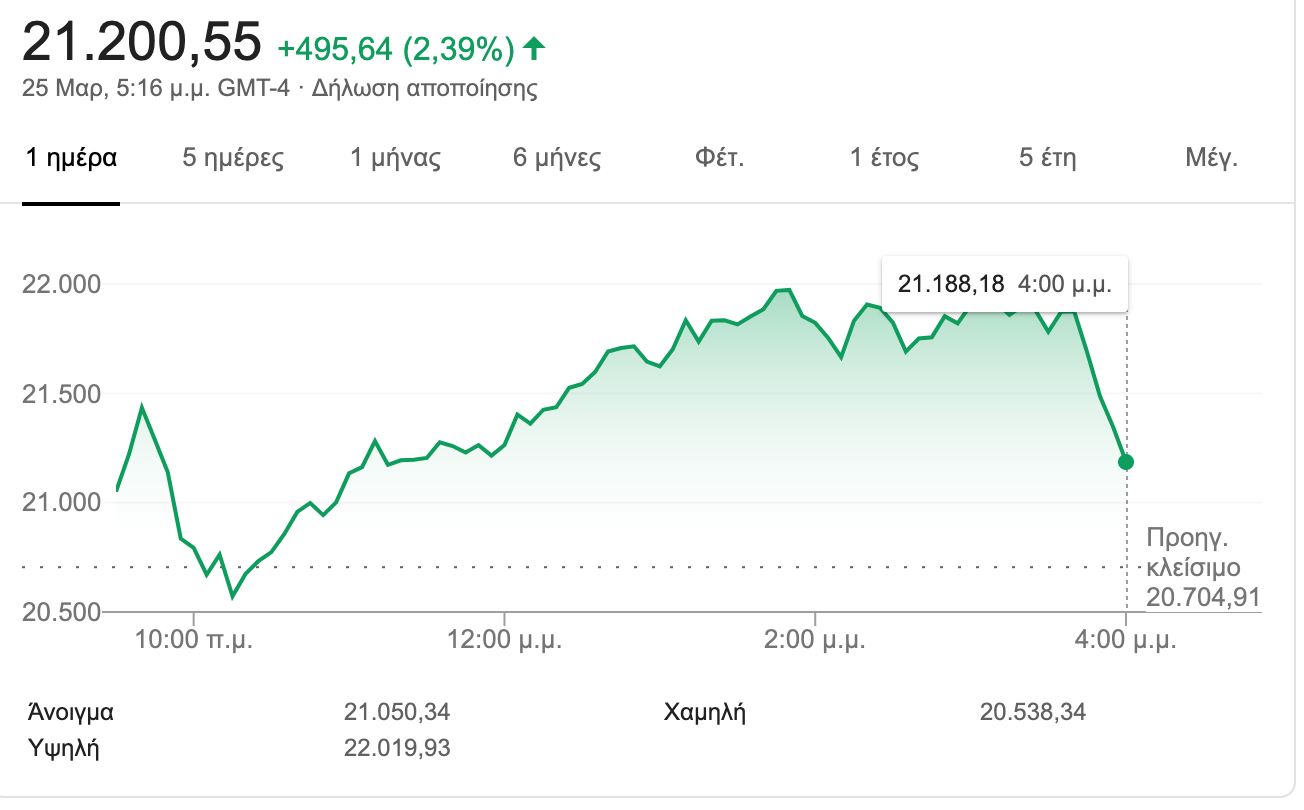 Ο βιομηχανικός δείκτης Dow Jones πάντως έκλεισε με άνοδο +2,39%, στις 21.200,55 μονάδες, ενώ χθες είχε καταγράψει άνοδο άνω του 11%. Είναι η πρώτη φορά εδώ και έναν μήνα που ο δείκτης σημειώνει άνοδο για δύο συνεχόμενες συνεδριάσεις. Η σημερινή άνοδός του οφείλεται κατά πολύ στη Boeing, η μετοχή της οποίας κέρδισε πάνω από 24%, καθώς οι επενδυτές θεωρούν βέβαιο ότι η εταιρεία θα είναι από τις μεγάλες κερδισμένες των μέτρων παροχής οικονομικής στήριξης.