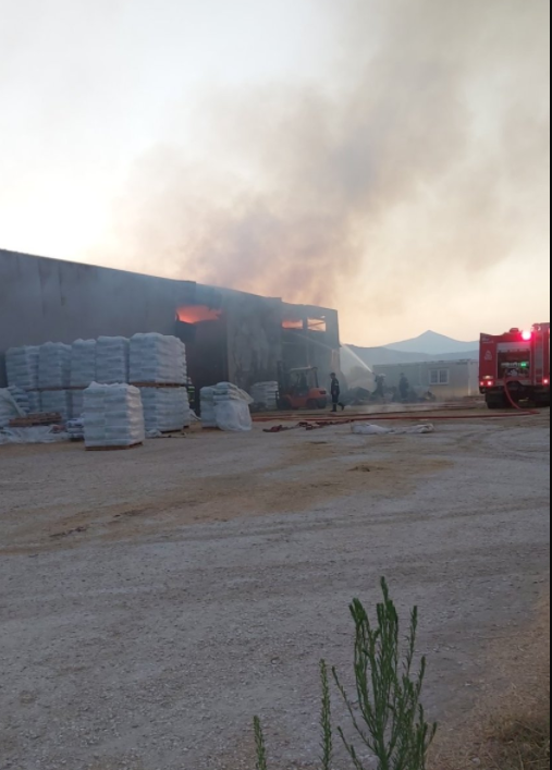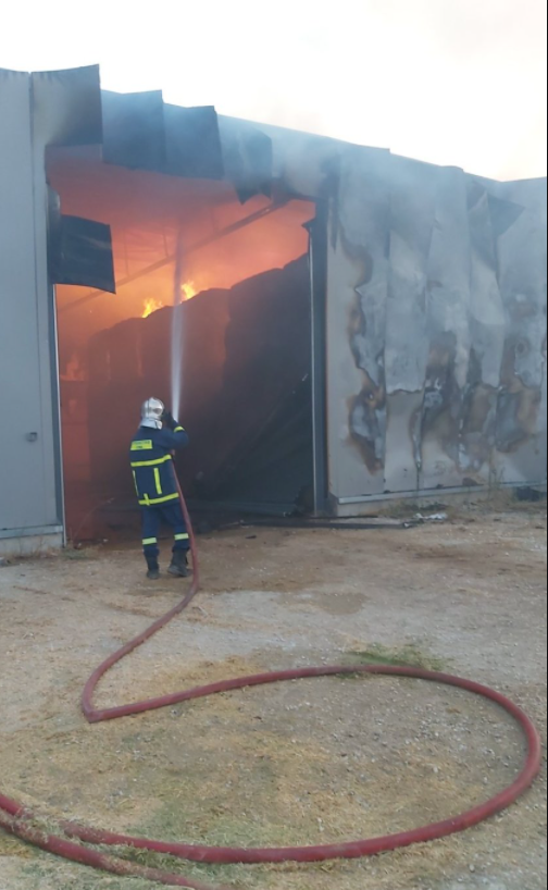 Η πυρκαγιά μαίνεται από τα ξημερώματα της Κυριακής, με τους πυροσβέστες να επιχειρούν ακόμα στο σημείο καθώς καίει εύφλεκτα υλικά, όπως πρώτες ύλες και επεξεργασμένα προϊόντα (άχυρα κτλ).