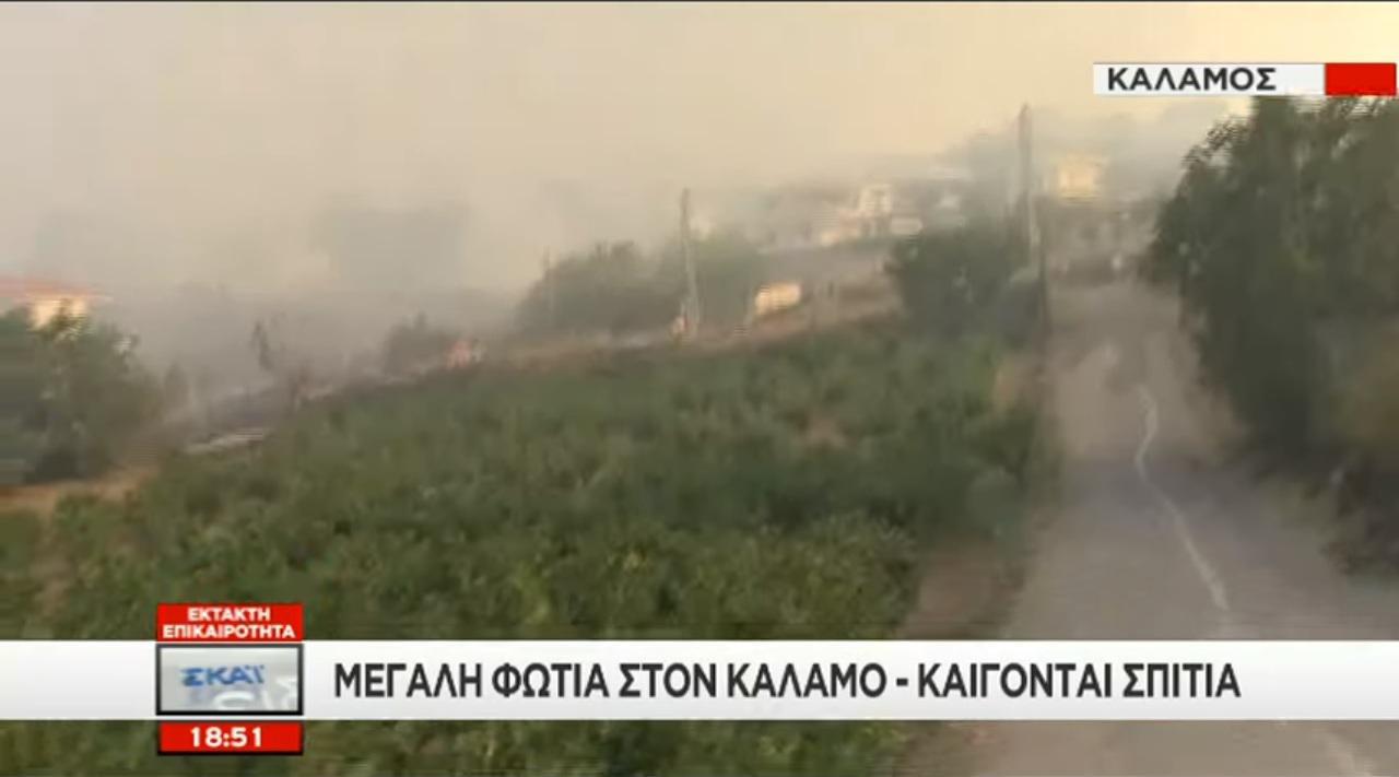 Σε πλήρη εξέλιξη είναι η μεγάλη πυρκαγιά στον Κάλαμο, όπου οι φλόγες έχουν προξενήσει σοβαρές σε σπίτια, από αυτά που είναι διάσπαρτα στην περιοχή, η οποία αποτελείται κυρίως από πυκνό αναδασωμένο δάσος. Πριν από λίγο μεταφέρθηκε στο 401 Στρατιωτικό νοσοκομείο ο Περιφερειάρχης Αττικής του Πυροσβεστικού Σώματος, υποστράτηγος Κων/νος Γιόβας, ο οποίος συντόνιζε το έργο της κατάσβεσης. Οι πρώτες πληροφορίες αναφέρουν ότι λόγω της μεγάλης έντασης ένιωσε αδιαθεσία και χρειάστηκε η μεταφορά του στο νοσοκομείο, όπου υποβάλλεται προληπτικά σε ιατρικές εξετάσεις. Ο ακριβής αριθμός των σπιτιών που έχουν υποστεί ζημιές δεν έχει γίνει γνωστός, αλλά οι πληροφορίες κάνουν λόγο για 15-20, εκ των οποίων περίπου 5 έχουν πιο σοβαρές ζημιές. Οι ισχυρές δυνάμεις πυρόσβεσης που επιχειρούν στην περιοχή, έχουν καταφέρει, σύμφωνα με αξιωματικούς του Π.Σ., να περιορίσουν ένα μέτωπο της πυρκαγιάς, ωστόσο το έργο τους είναι εξαιρετικά δύσκολο, λόγω της «μικτής» κάλυψης, (δάσος και σπίτια), του πυκνού καπνού και των ισχυρών ανέμων που πνέουν στην περιοχή.