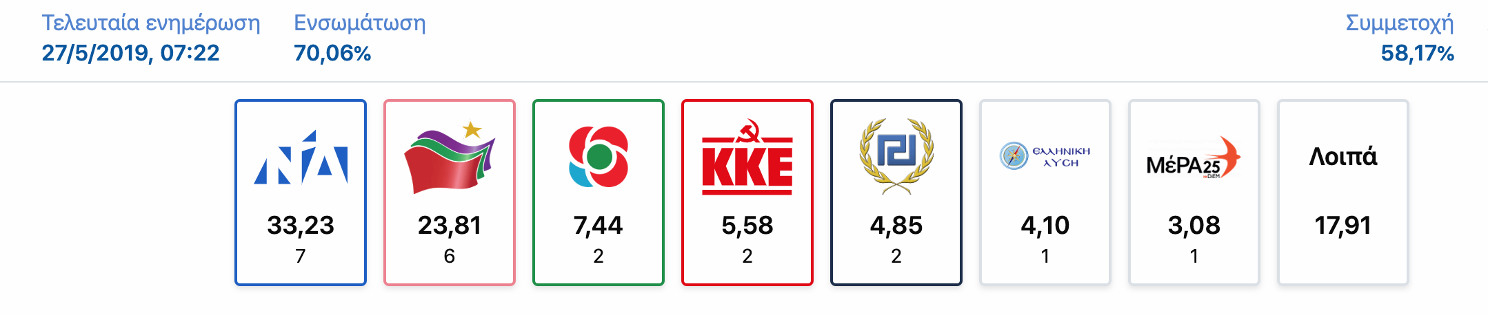 Στην ενσωμάτωση του 70% που δίνει αυτή την ώρα το ΥΠΕΣ η διαφορά διαμορφώνεται στις 9, 5 μονάδες.