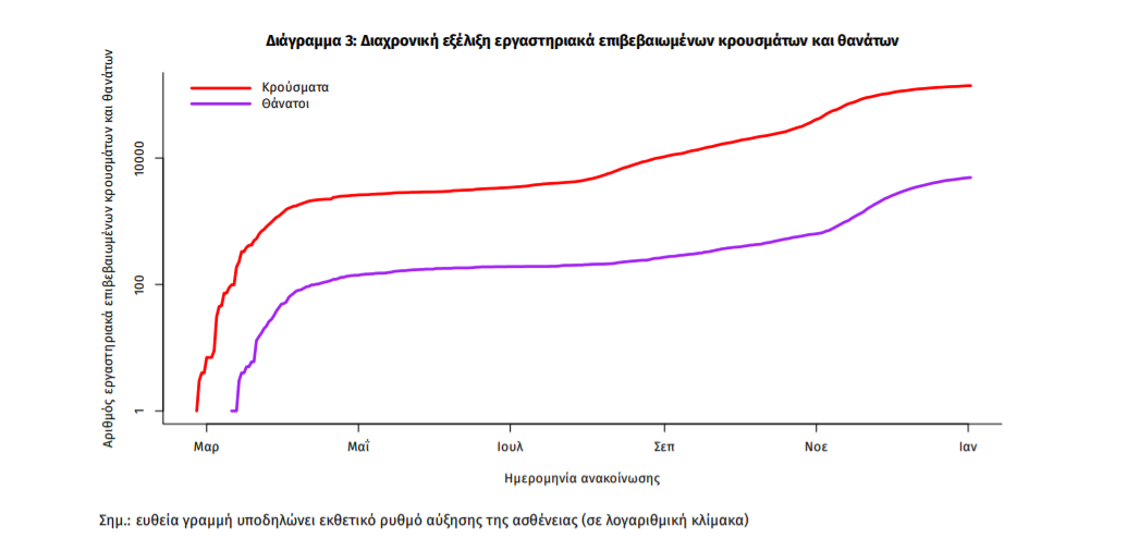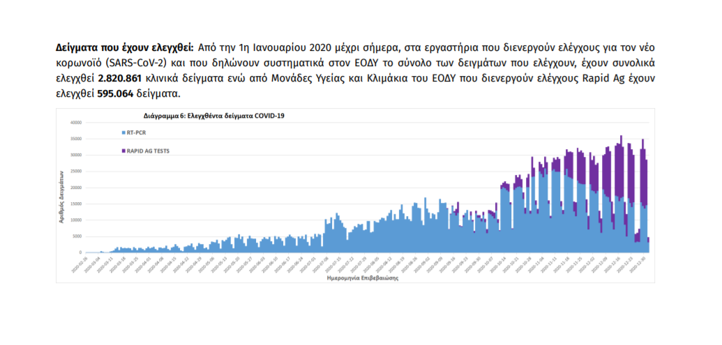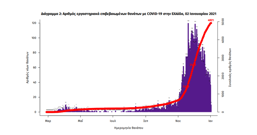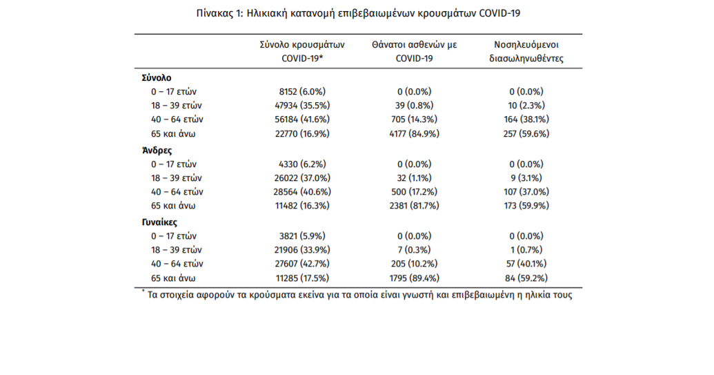 Τέλος, έχουμε 40 νέους θανάτους από τη νόσο COVID-19, φθάνοντας τους 4921 θανάτους συνολικά στη χώρα, εκ των οποίων 2918 (59.3%) άνδρες. Η διάμεση ηλικία των θανόντων συμπολιτών μας ήταν τα 79 έτη και το 95.5% είχε κάποιο υποκείμενο νόσημα ή/και ηλικία 70 ετών και άνω.