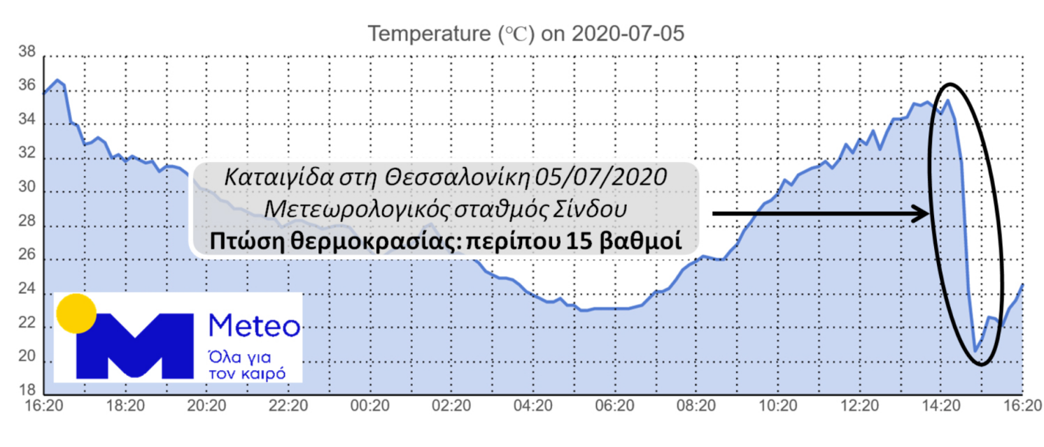 Εντυπωσιακή ήταν η πτώση της θερμοκρασίας κατά τη διάρκεια του φαινομένου. Όπως φαίνεται χαρακτηριστικά στο γράφημα που ακολουθεί, η πτώση της θερμοκρασίας στη Σίνδο πλησίασε τους 15 βαθμούς σε 40 μόλις λεπτά. Στον ίδιο σταθμό καταγράφηκε ριπή ανέμου ίση με 84 χλμ/ώρα στις 14:56, λίγα λεπτά πριν την έναρξη της βροχόπτωσης.