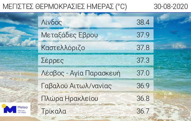 Υψηλές θερμοκρασίες καταγράφηκαν τόσο στις ηπειρωτικές περιοχές, όσο και στα νησιά του Ανατολικού Αιγαίου και στα Δωδεκάνησα. Όπως φαίνεται στον πίνακα που ακολουθεί και παρουσιάζει τους σταθμούς που κατέγραψαν τις 8 υψηλότερες θερμοκρασίες, η υψηλότερη εξ αυτών σημειώθηκε στη Λίνδο (38.4C) και ακολούθησαν οι Μεταξάδες Έβρου (37.9C) και το Καστελλόριζο (37.8C).