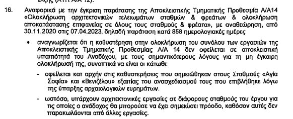 Το έγγραφο το οποίο μπορείτε να δείτε αναλυτικά ΕΔΩ καταγράφει αναλυτικά το διάστημα καθυστέρησης της παράδοσης του έργου κατά σταθμό, αλλά και στο σύνολο του, με την Αττικό Μετρό να αποφασίζει:
