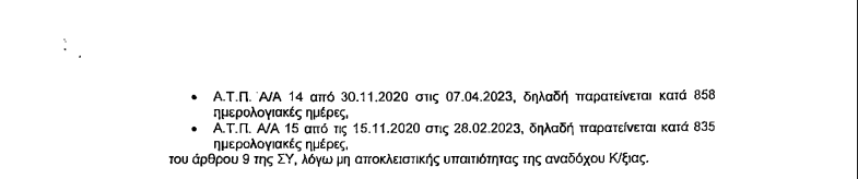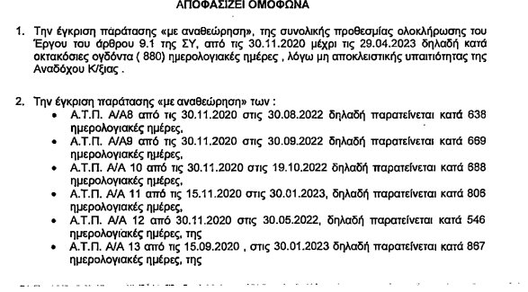 «Την έγκριση παράτασης “με αναθεώρηση”, της συνολικής προθεσμίας ολοκλήρωσης του Έργου, από τις 30/11/2020 μέχρι τις 29/04/2023, δηλαδή κατά 880 ημερολογιακές ημέρες, λόγω μη αποκλειστικής υπαιτιότητας της Αναδόχου Κ/ξιας».