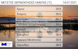 Επαληθεύτηκαν τα προγνωστικά στοιχεία όπως παρουσιάστηκαν στην πρωινή ανακοίνωση της Τετάρτης 14/07 του Εθνικού Αστεροσκοπείου Αθηνών / meteo.gr, με τις μέγιστες θερμοκρασίες στα κεντρικά και νότια να φτάνουν τοπικά τους 39-40 ⁰C, με τη μεγαλύτερη τιμή να καταγράφεται στο Άργος με 39,8 ⁰C.