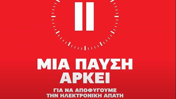 «Μια Παύση Αρκεί για να Αποφύγουμε την Ηλεκτρονική Απάτη» είναι το κεντρικό μήνυμα του τηλεοπτικού σποτ στο πλαίσιο της εκστρατεία ενημέρωσης και ευαισθητοποίησης για τις ηλεκτρονικές απάτες που βρίσκεται σε εξέλιξη από το υπουργείο Προστασίας του Πολίτη, την Τράπεζα της Ελλάδος, την Ελληνική Αστυνομία και την Ελληνική Ένωση Τραπεζών (ΕΕΤ) που έχουν ενώσει τις δυνάμεις τους για την ενημέρωση του κοινού.