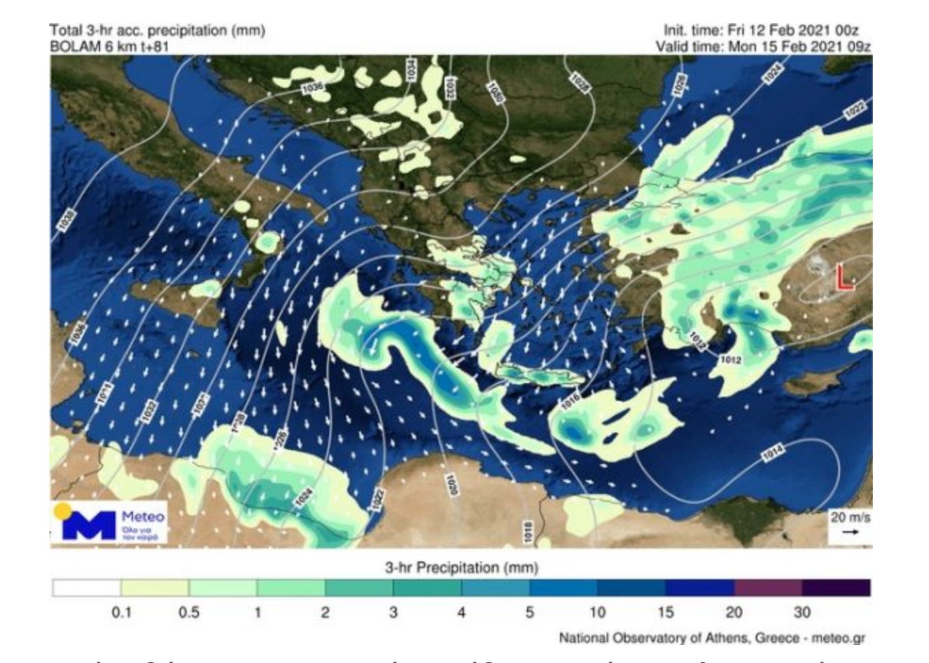 - Κατά περιόδους πυκνές χιονοπτώσεις σε ηπειρωτικές περιοχές με πολύ χαμηλό υψόμετρο από το ύψος της Θεσσαλίας και νοτιότερα