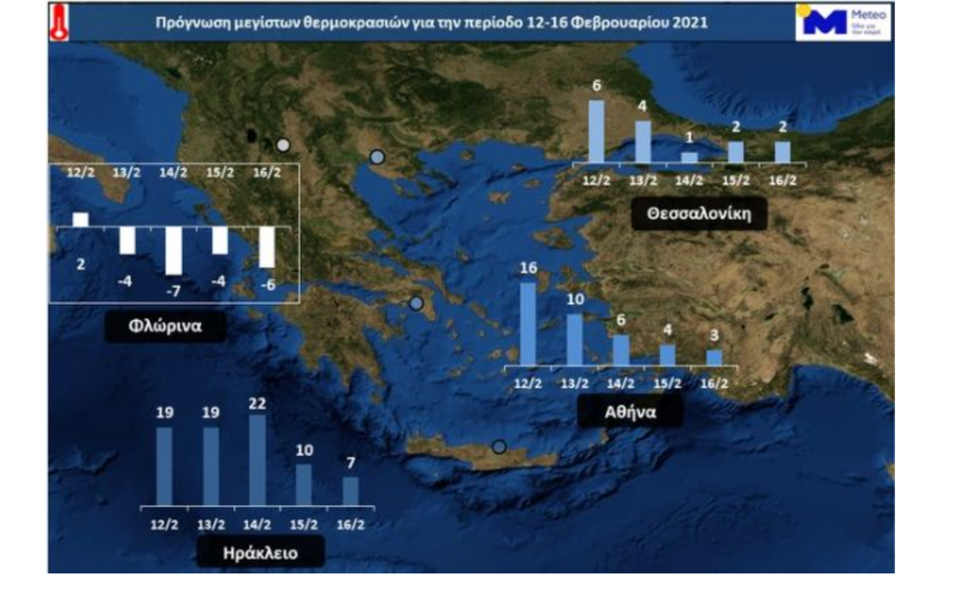 Ενδεικτικά αναφέρεται ότι στην πόλη της Αθήνας, η θερμοκρασία την Τρίτη 16/02 δεν θα ξεπεράσει τους 3 βαθμούς, σημειώνοντας μια πτώση της τάξης των 13 βαθμών συγκριτικά με τη θερμοκρασία της Παρασκευής 12/02, ενώ στη Φλώρινα από το Σάββατο 13/02 έως την Τρίτη 16/02 θα επικρατήσουν συνθήκες ολικού παγετού.