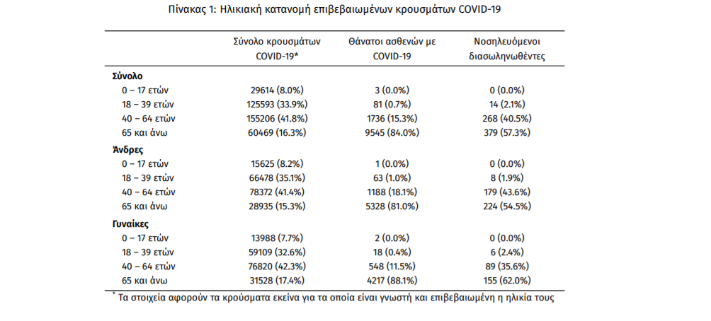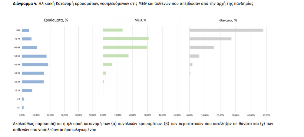 Ο αριθμός των ασθενών που νοσηλεύονται διασωληνωμένοι είναι 661 (62.5% άνδρες). Η διάμεση ηλικία τους είναι 67 έτη. To 82.6% έχει υποκείμενο νόσημα ή/και ηλικία 70 ετών και άνω. Από την αρχή της πανδημίας έχουν εξέλθει από τις ΜΕΘ 2.272 ασθενείς. Οι εισαγωγές2 νέων ασθενών Covid-19 στα νοσοκομεία της επικράτειας είναι 302 (ημερήσια μεταβολή -20.73%). Ο μέσος όρος εισαγωγών του επταημέρου είναι 334 ασθενείς.Η διάμεση ηλικία των κρουσμάτων είναι 44 έτη (εύρος 0.2 έως 106 έτη), ενώ η διάμεση ηλικία των θανόντων είναι 78 έτη (εύρος 0.2 έως 106 έτη)