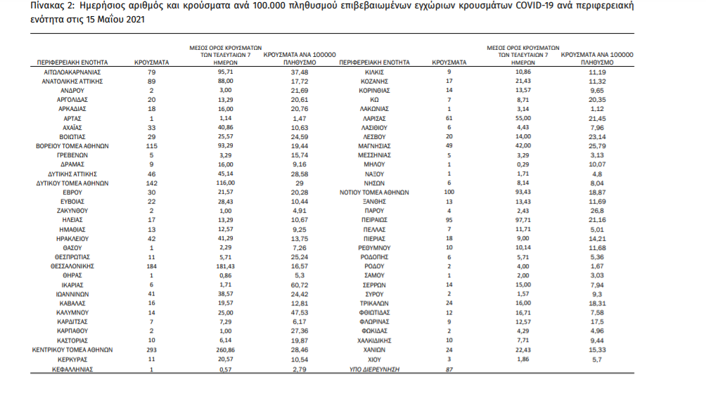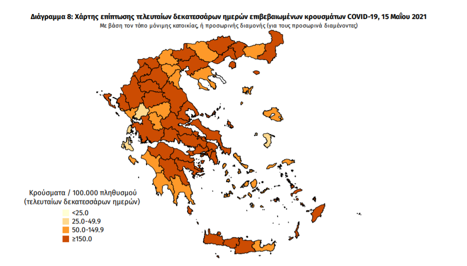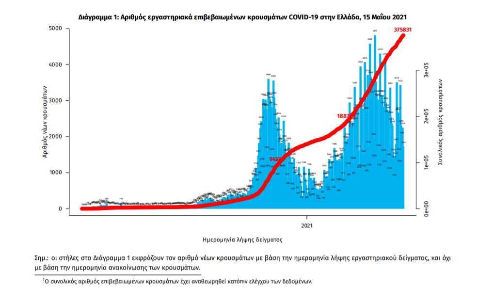 Τα νέα εργαστηριακά επιβεβαιωμένα κρούσματα της νόσου που καταγράφηκαν τις τελευταίες 24 ώρες είναι 1.957, εκ των οποίων 2 εντοπίστηκαν κατόπιν ελέγχων στις πύλες εισόδου της χώρας. Ο συνολικός αριθμός των κρουσμάτων ανέρχεται σε 375.831 (ημερήσια μεταβολή +0.5%), εκ των οποίων 51.2% άνδρες. Με βάση τα επιβεβαιωμένα κρούσματα των τελευταίων 7 ημερών, 49 θεωρούνται σχετιζόμενα με ταξίδι από το εξωτερικό και 2.677 είναι σχετιζόμενα με ήδη γνωστό κρούσμα