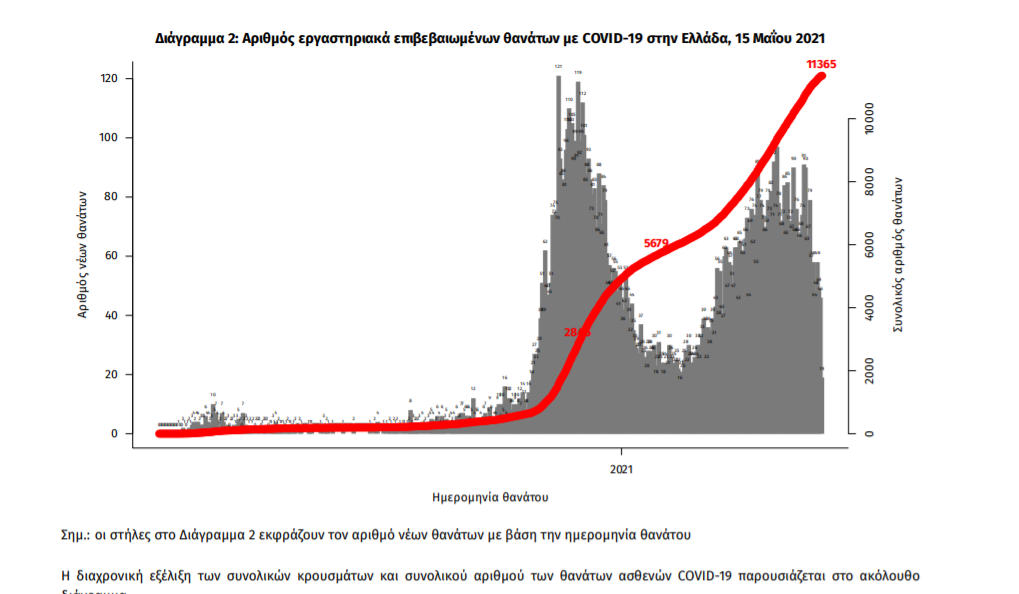 Οι νέοι θάνατοι ασθενών με COVID-19 είναι 43, ενώ από την έναρξη της επιδημίας έχουν καταγραφεί συνολικά 11.365 θάνατοι. Το 95.2% είχε υποκείμενο νόσημα ή/και ηλικία 70 ετών και άνω.