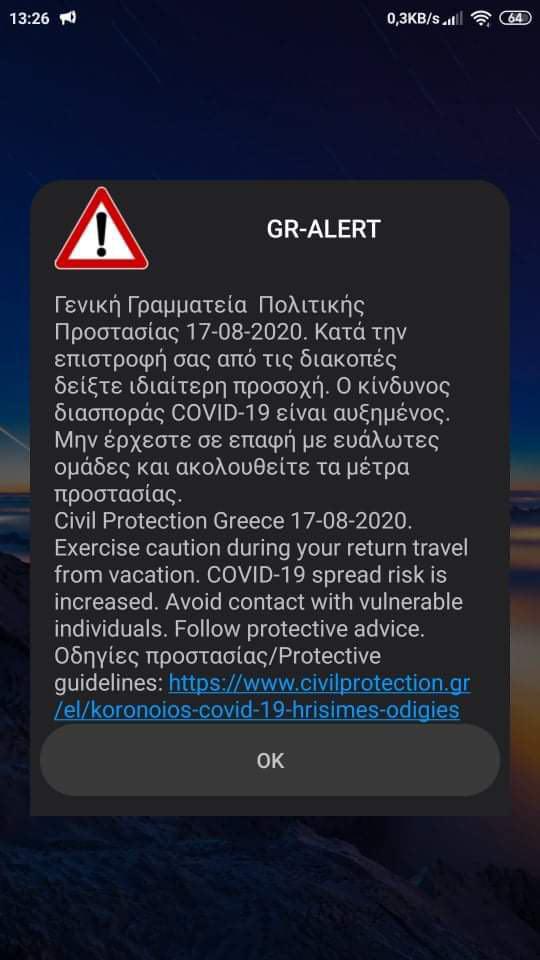 Την προσοχή όλων εφιστά με νέο μήνυμά της από το 112 η Γενική Γραμματεία Πολιτικής Προστασίας, με αφορμή τον ολοένα και αυξανόμενο αριθμό νέων κρουσμάτων. Το μήνυμα έφθασε στα κινητά των πολιτών λίγο μετά τις 13.30 και εφιστά την προσοχή όσων γυρίζουν από τις διακοπές τους.