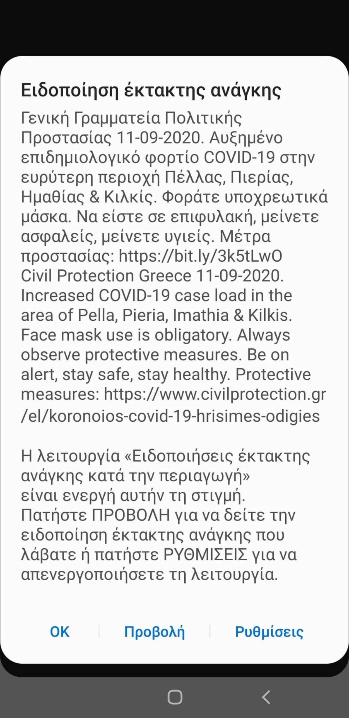 Το μήνυμα έφθασε στα κινητά των πολιτών περίπου στη 13:00 και προτρέπει τους πολίτες να φορούν μάσκα. ”Αυξημένο επιδημιολογικό φορτίο COVID-19 στην ευρύτερη περιοχή Πέλλας, Πιερίας, Ημαθίας και Κιλκίς. Να είστε σε επιφυλακή, μείνετε ασφαλείς, μείνετε υγιείς.”