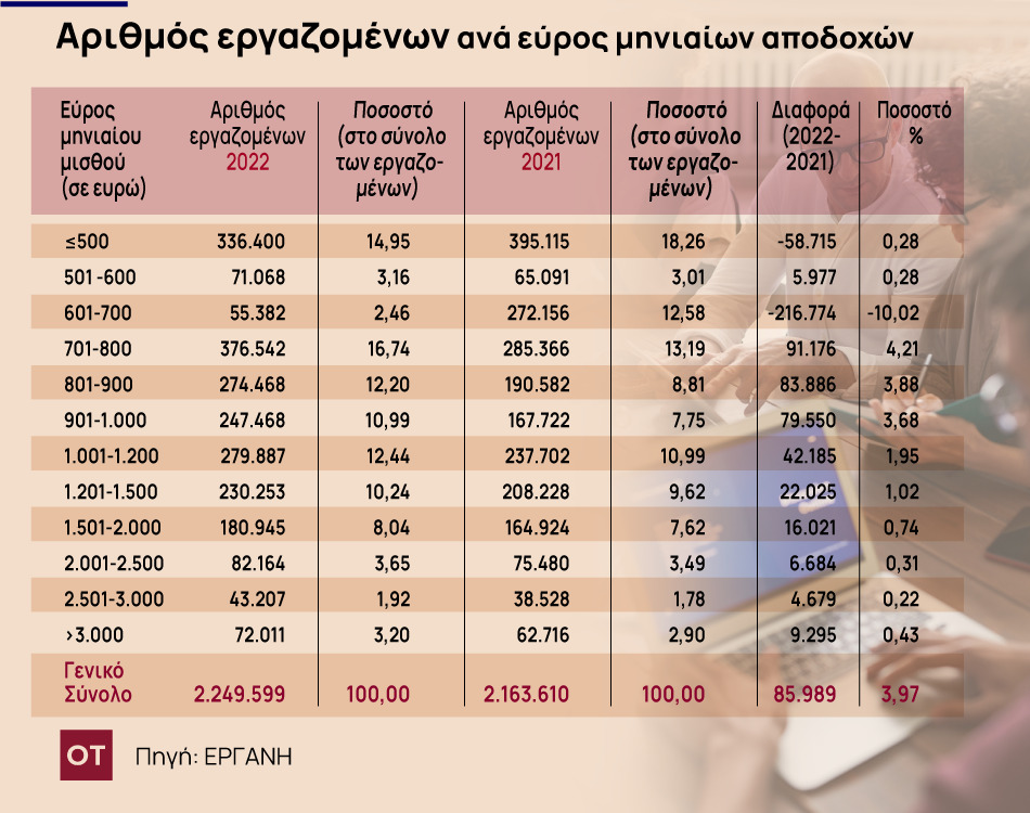 Σύμφωνα με τα στοιχεία του πληροφοριακού συστήματος ΕΡΓΑΝΗ (πίνακας) το 2022 οι απασχολούμενοι που λαμβάνουν έως 700 ευρώ το μήνα μειώθηκαν κατά 269.512 άτομα, ενώ κατά 17,2% μειώθηκαν οι εργαζόμενοι που λαμβάνουν λιγότερα από 500 ευρώ (εργαζόμενοι μερικής απασχόλησης).