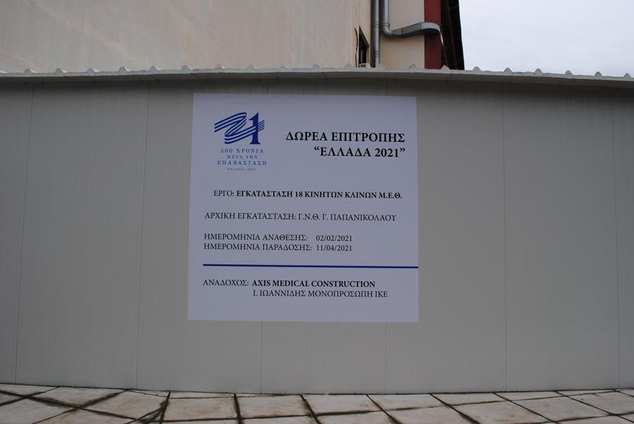 Η νέα αυτή μονάδα είναι δωρεά της Επιτροπής “Ελλάδα 2021” και συνιστά καθοριστική συμβολή για την αντιμετώπιση και διαχείριση της πανδημίας στο Νοσοκομείο. Πρόκειται για δύο πλήρως εξοπλισμένες πτέρυγες των 9 κλινών. Η Μονάδα θα ξεκινήσει σταδιακά τη λειτουργία της αρχικά με τη μεταφορά ασθενών με COVID 19 από τη Μονάδα Εγκαυμάτων του Νοσοκομείου όπου νοσηλεύονται έως σήμερα ασθενείς. Η δωρεά αγγίζει το ποσό των 2.430.000 ευρώ και για την υλοποίηση αυτού του σχεδίου συνέβαλαν με την ευγενική χορηγία τους η εταιρεία ΑΔΜΗΕ με την κατασκευή νέου υποσταθμού ηλεκτρικού ρεύματος που ενίσχυσε το δίκτυο του Νοσοκομείου και η εταιρεία ΕΠΙΜΕΝΤ που κάλυψε επι μέρους κατασκευαστικές εργασίες. Ενστερνιζόμενοι τα εμπνευσμένα λόγια του Σεβασμιώτατου κατά τον αγιασμό της νέας Μονάδας, «μπορεί η μάσκα να κρύβει το χαμόγελο, αλλά μπορούμε πάντα να αγκαλιαστούμε με την ψυχή και την καρδιά, τηρώντας αποστάσεις και κάνοντας το εμβόλιο», ευχόμασε σε όλους Υγεία και Καλή Ανάσταση!