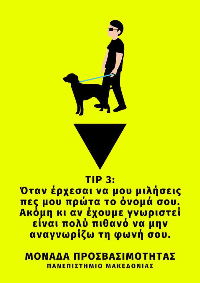 Η Μονάδα Προσβασιμότητας του Πανεπιστημίου Μακεδονίας, δημιούργησε και δημοσίευσε επτά απλές συμβουλές- υποδείξεις που στοχεύουν να κάνουν καλύτερη τη καθημερινή ζωή των ατόμων με αναπηρία.