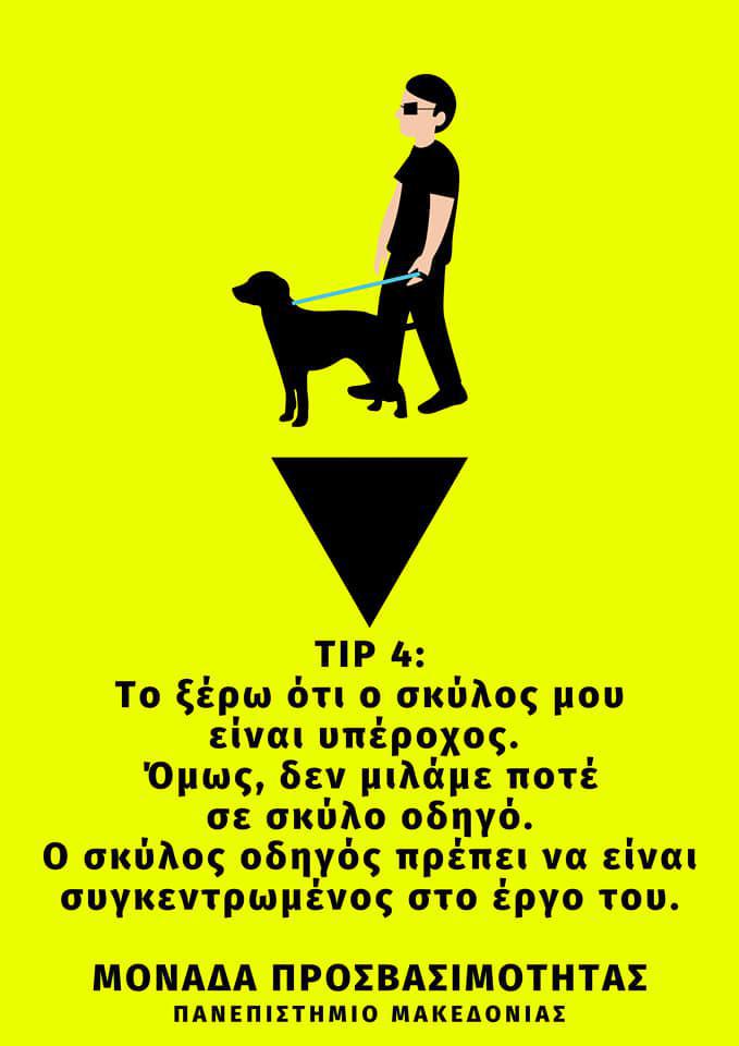 «Ρώτησέ με αν χρειάζομαι βοήθεια», «όταν έρχεσαι να μου μιλήσεις, πες μου πρώτα το όνομά σου», «δε μιλάμε ποτέ σε σκύλο- οδηγό», «μην παρκάρεις στη θέση μου», «μην παρκάρεις πάνω στους οδηγούς όδευσης τυφλών». Προτροπές αυτονόητες σε μία πολιτισμένη κοινωνία, κανόνες γνωστοί σε όλους. Ή μήπως -εκ του αποτελέσματος της καθημερινότητας των ΑμεΑ- όχι;. Η Μονάδα Προσβασιμότητας του Πανεπιστημίου Μακεδονίας, δημιούργησε και δημοσίευσε επτά απλές συμβουλές- υποδείξεις που στοχεύουν να κάνουν καλύτερη τη καθημερινή ζωή των ατόμων με αναπηρία. «Βοήθησε και εσύ στη διάδοσή τους», καλεί τους πολίτες.