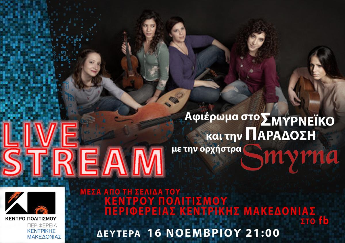 «Αφιέρωμα στο Σμυρνέϊκο και στην παράδοση» , το μουσικό σχήμα Smyrna, 5 νέες γυναίκες από όλη την Ελλάδα σ’ ένα πρόγραμμα με τραγούδια που έχουν τις ρίζες τους σ’ ένα πολιτισμό που σμιλεύτηκε μέσα από διαφορετικές κουλτούρες. Με τις χαρακτηριστικά αναγνωρίσιμες φωνές τους, μας παρασύρουν με το προσωπικό τους ύφος, αρμονικά δεμένο με το χθες και συνδυάζοντας τη φρεσκάδα με την παράδοση, μας ταξιδεύουν μελωδικά στο χρόνο με σκοπούς και τραγούδια από τη Μικρά Ασία, την Καππαδοκία, την Κωνσταντινούπολη, τη Θράκη, την Μακεδονία, την Ήπειρο, το Αιγαίο αλλά και Σμυρνιών συνθετών.