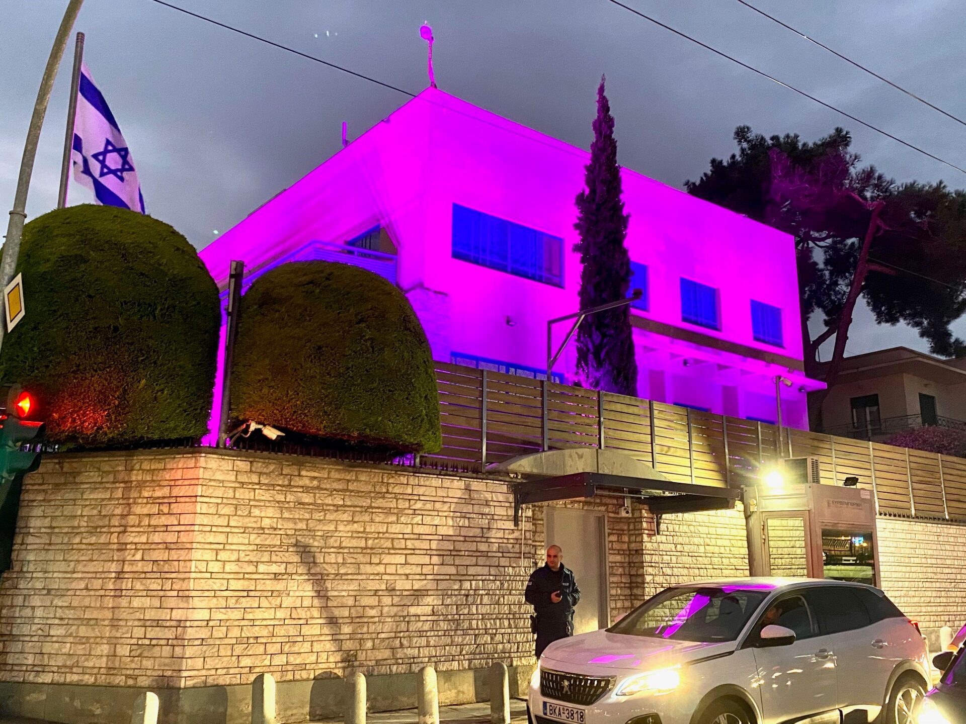 Με μωβ χρώμα φωταγωγήθηκε σήμερα η Πρεσβεία του Ισραήλ στην Αθήνα και για τις επόμενες δύο ημέρες με αφορμή την Παγκόσμια Ημέρα Ατόμων με Αναπηρία