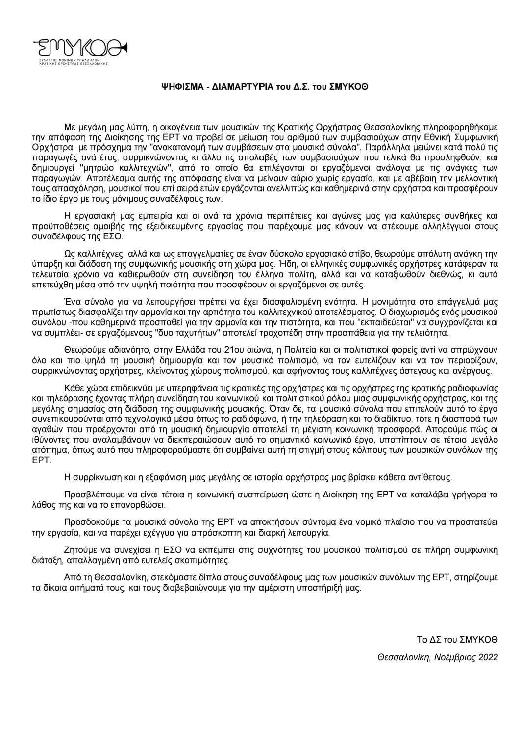 «Με μεγάλη μας λύπη η οικογένεια των μουσικών της Κρατικής Ορχήστρας Θεσσαλονίκης πληροφορηθήκαμε της απόφαση της Διοίκησης της ΕΡΤ να προβεί σε μείωση του αριθμού των συμβασιούχων στην Εθνική Συμφωνική Ορχήστρα, με πρόσχημα την “ανακατανομή των συμβάσεων στα μουσικά σύνολα”. Παράλληλα μειώνει κατά πολύ τις παραγωγές ανά έτος, συρρικνώνοντας κι άλλο τις απολαβές των συμβασιούχων που τελικά θα προσληφθούν και δημιουργεί “μητρώο καλλιτεχνών” από το οποίο θα επιλέγονται οι εργαζόμενοι ανάλογα με τις ανάγκες των παραγωγών. Αποτέλεσμα αυτής της απόφασης είναι να μείνουν αύριο χωρίς εργασία και με αβέβαιη την μελλοντική τους απασχόληση, μουσική επί σειρά ετών εργάζονται ανελλιπώς και καθημερινά στην ορχήστρα και προσφέρουν το ίδιο έργο με τους μόνιμους συναδέλφους των.