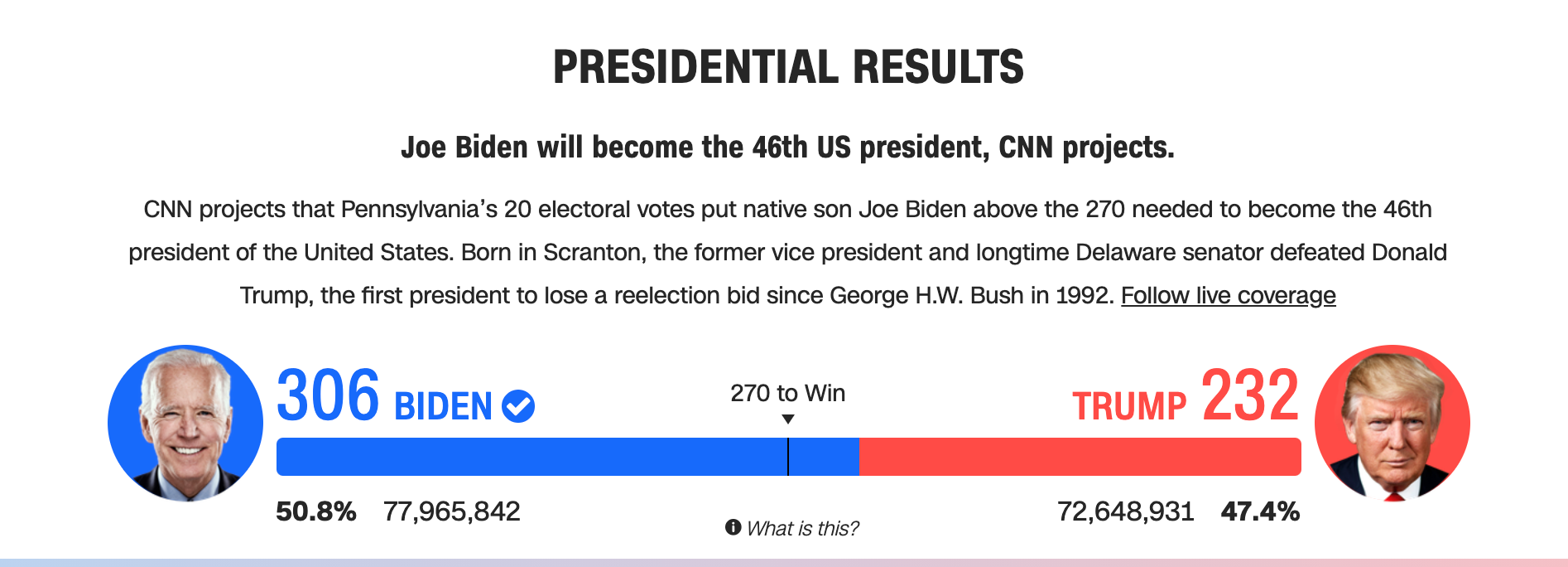 Σύμφωνα με το Edison Research, ο Μπάιντεν έχει εξασφαλίσει 306 εκλέκτορες έναντι 232 του Τραμπ.